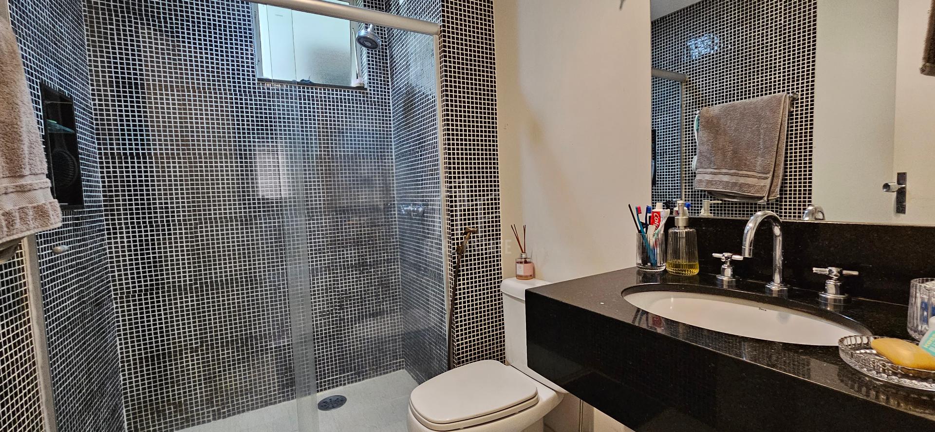 Banheiro espaçoso com Box e água quente na pia.